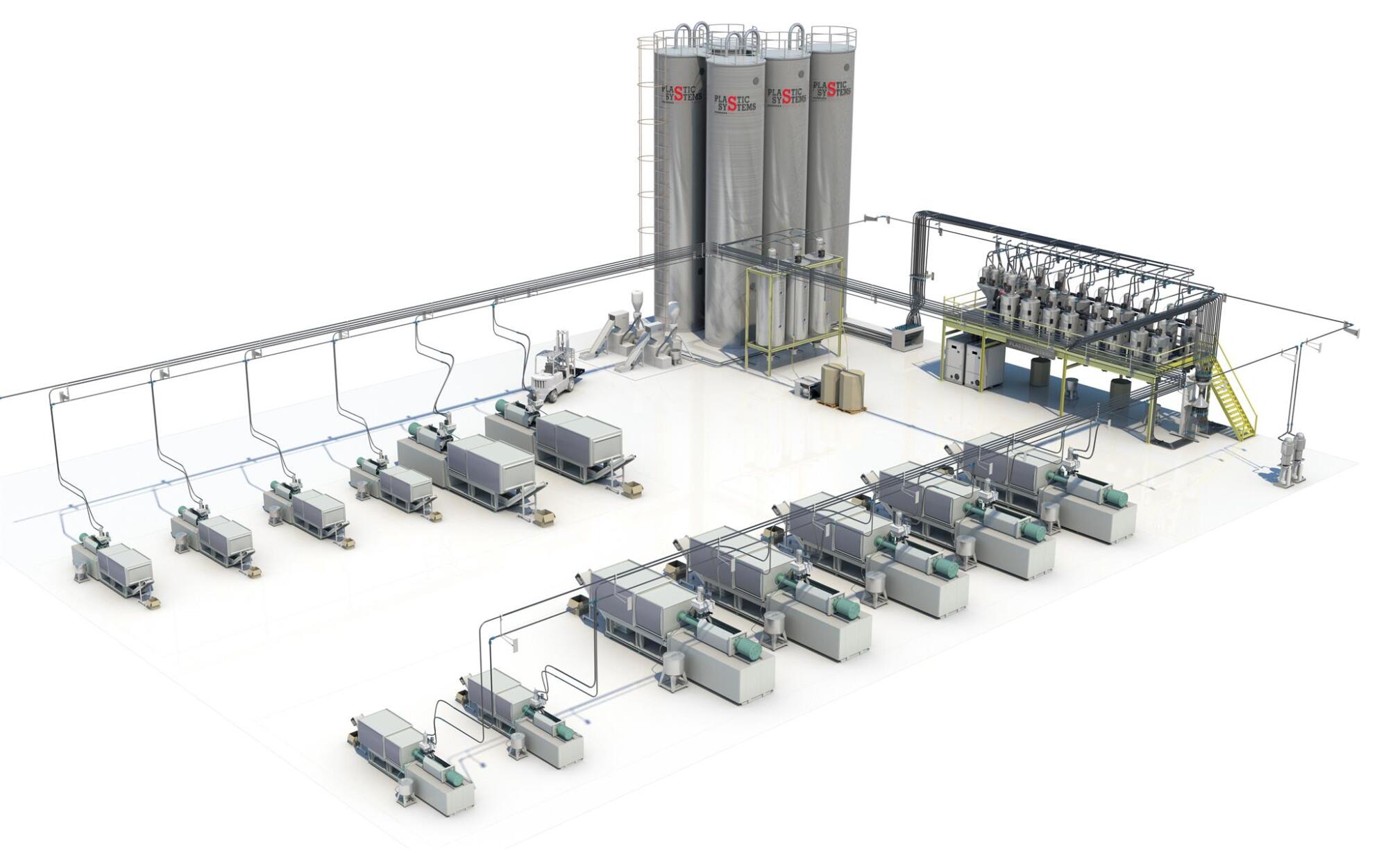 采用微機(jī)集中自動(dòng)控制,根據(jù)機(jī)臺(tái)分布和用料情況,結(jié)合輔機(jī)設(shè)備,實(shí)現(xiàn)數(shù)據(jù)化集中供料、控制,全場無人化不間斷生產(chǎn)的系統(tǒng)解決方案